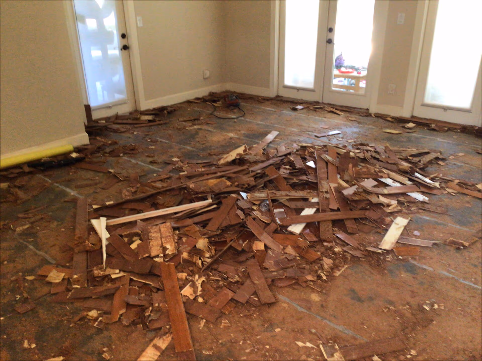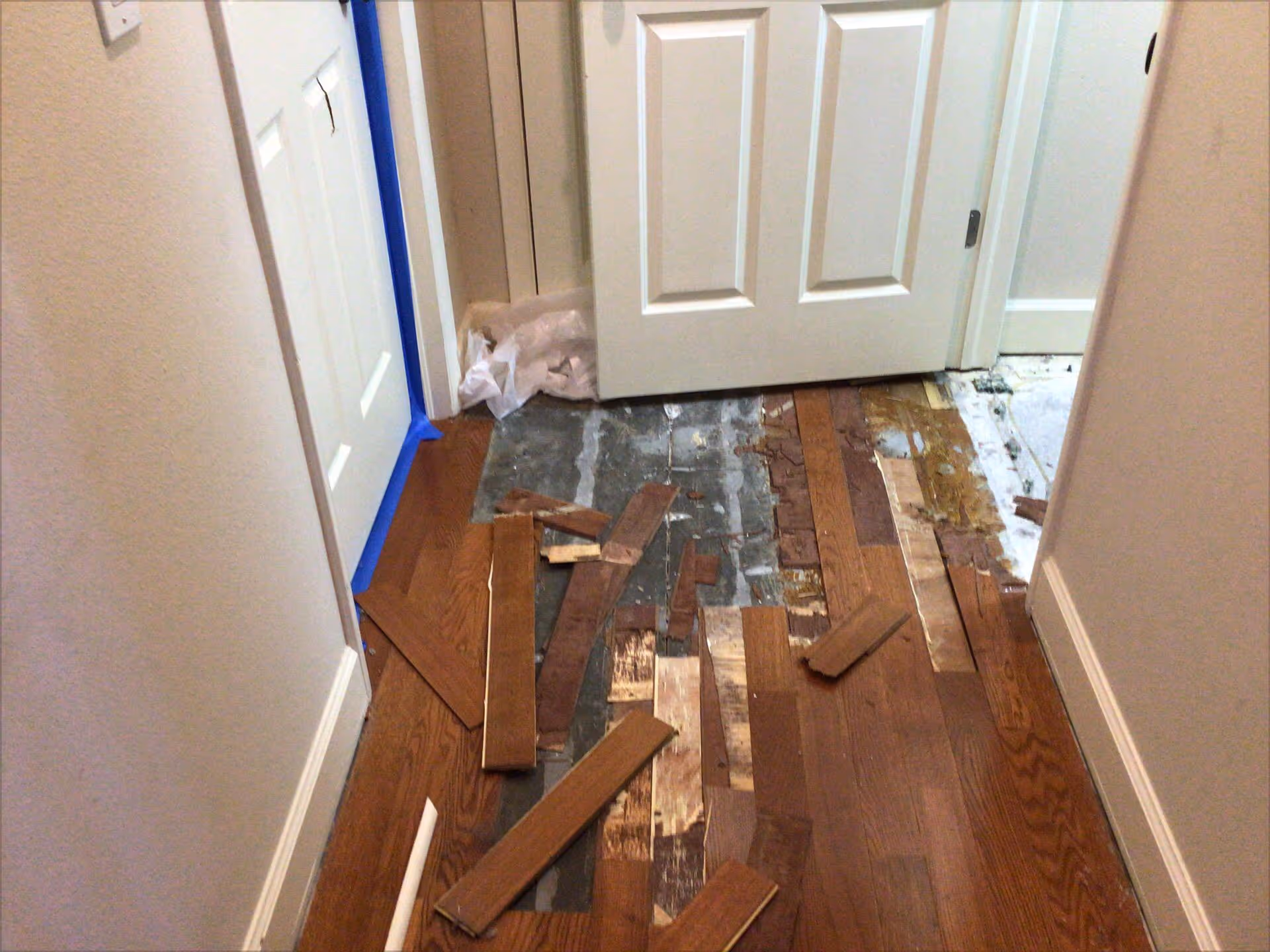 This home had a leaky AC that ruined a hardwood floor. Here you can see where we removed the damaged hardwood and restored the floor to looking even better than it did before!